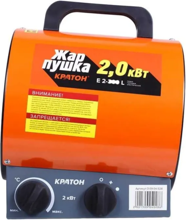 Модель Кратон Жар-пушка Е 2-300 L – это особый вид отопительного устройства, который помещен в металлический корпус. Нагрев воздуха обеспечивается работой нагревательного элемента, а его циркуляция – вентилятором. Агрегат имеет терморегулятор, позволяющий настраивать необходимую в помещении температуру.
