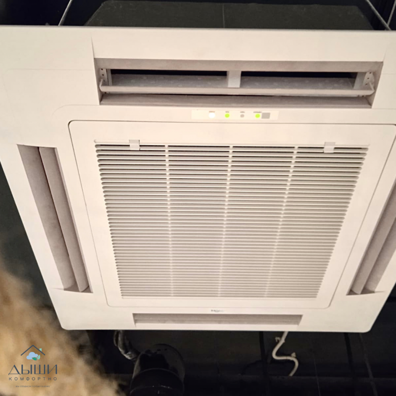 Для данного объекта был выбран кассетный кондиционер Haier AB24ES1ERA(S)/1U24GS1ERA, рассчитанный на площадь 65 м2. Наша компания произвела поставку и монтаж оборудования. Внутренний блок кондиционера установлен в запотолочном пространстве, наружный блок на улице на специальной подставке.